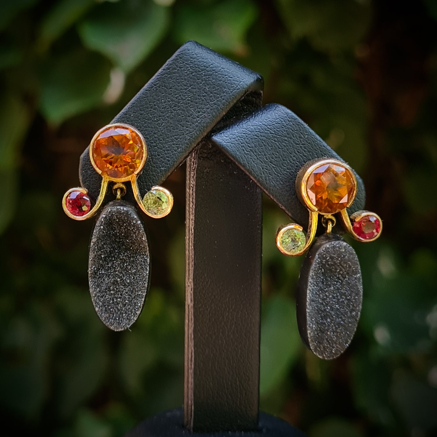 These quirky Earrings have orange, red and green garnets set in yellow metal that responds to tests for eighteen-carat gold, and a hanging sparkly black "geode-esque" stone.