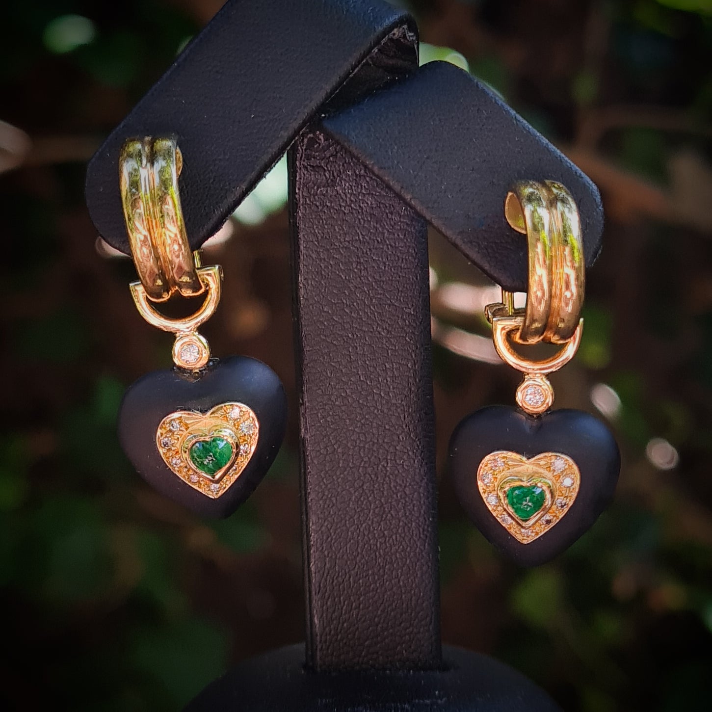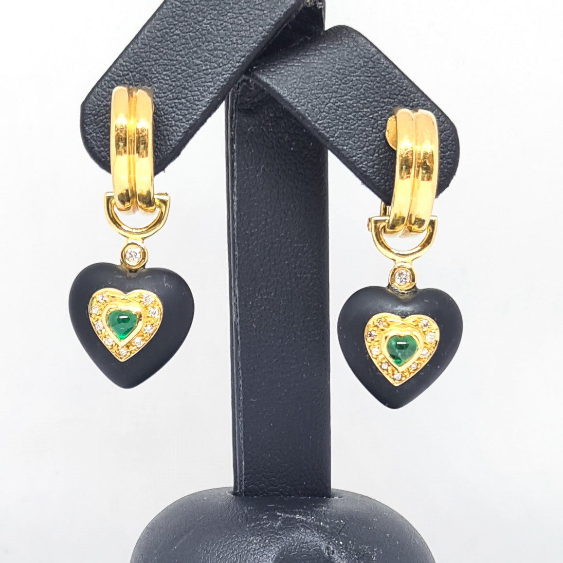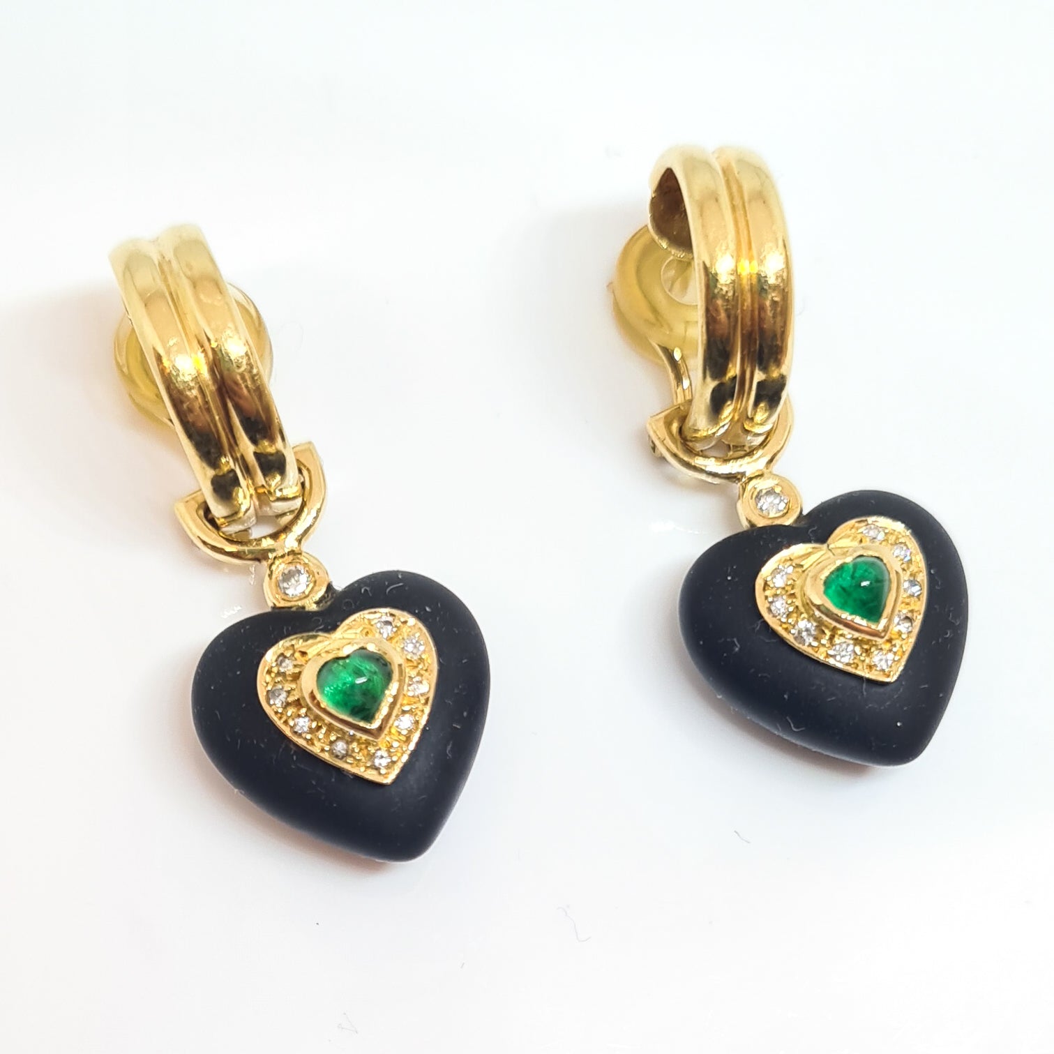 These unique drop Earrings feature a half hoop design with omega clip, and a hanging piece that features a black sea glass heart set with cabochon heart-shaped Emeralds and little round Diamonds. Both parts of the Earrings are made using yellow metal stamped "750" that responds positively to tests for eighteen-carat gold.
